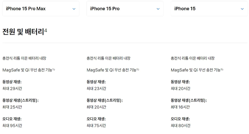 전작인 14 시리즈와 동일한 재생시간이므로 배터리의 용량 변화는 거의 없는 것으로 보입니다.