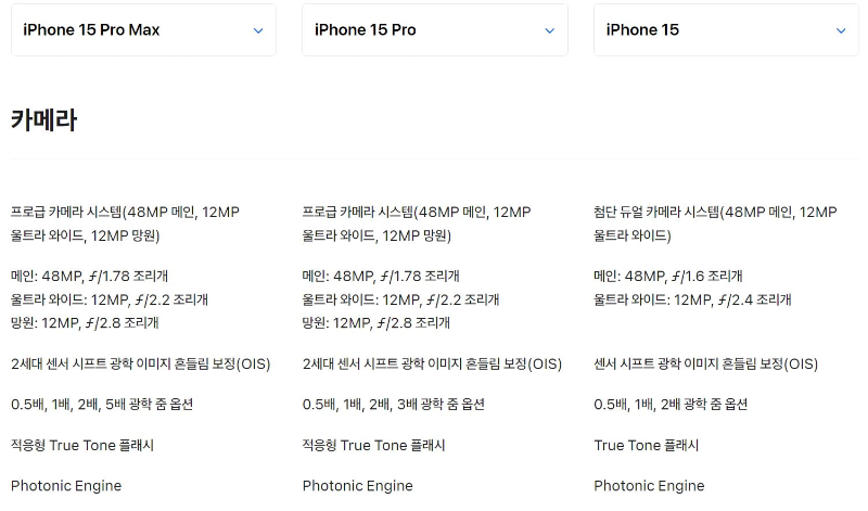 스펙을 비교해 보면서 가성비라는 측면을 고려했을때 아이폰 15 기본 모델이 상위 모델과 성능 차이도 크지 않고 가격은 20% 정도 차이가 나니 좋은 선택이 될 수 있겠다는 생각이 들었습니다.