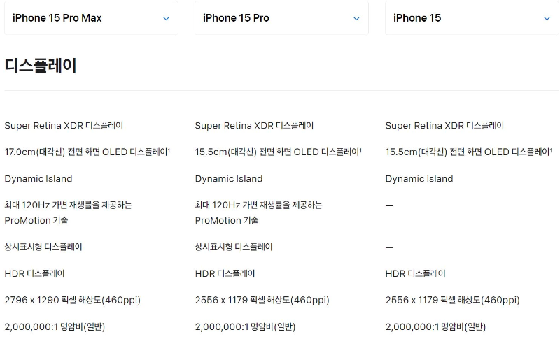 디스플레이의 스펙은 전작인 14 시리즈와 비교하여 큰 변화가 없습니다. 기본 모델인 아이폰 15의 화면 밝기가 Pro, Pro Max와 동일 수준으로 상향된 것은 긍정적인 측면이고, 기본 모델에서는 120Hz의 고주사율을 지원하지 않는 것은 아쉬운 점입니다.