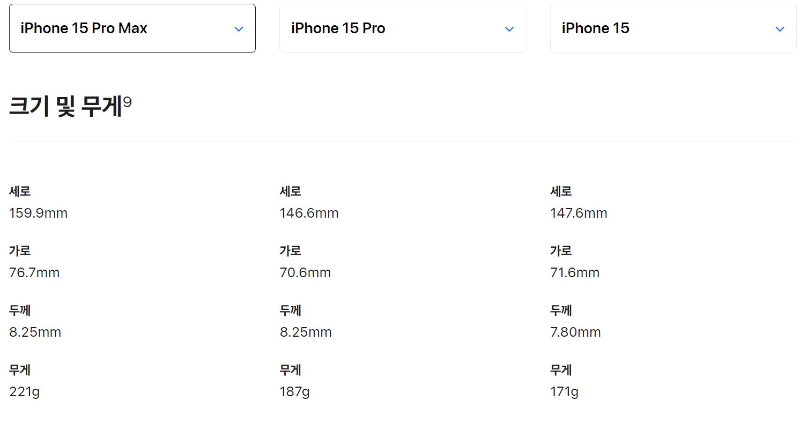 화면 Size와 외관 Size는 약간씩의 변화는 있지만 거의 동일한 수준이고 무게는 가벼워 졌습니다. 기본 모델은 172g에서 171g으로 1g 밖에 차이가 나지 않지만 Pro Max에서는 15 Pro Max가 221g, 14 Pro Max가 240g으로 19g 차이가 납니다.