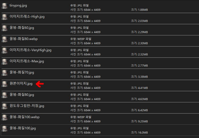 - 윈도우 그림판이나 꿀뷰 화질 100% 옵션에서는 파일용량이 증가함