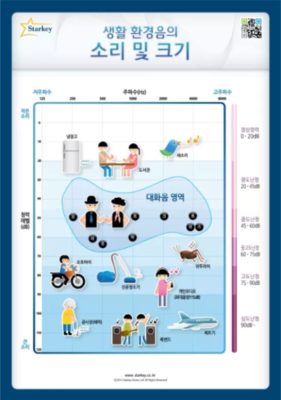 우리 일상 속에서 발생하는 소음의 크기 궁금하지 않으세요? 난청을 예방하기 위해서는 가급적 크고 자극적인 소리에 노출되는 횟수를 줄이는 것이 중요합니다. 아래 그림을 클릭하면 우리생활 속의 소음크기 확인해 볼 수 있습니다.