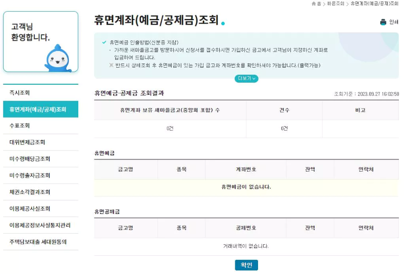 새마을금고 중앙회의 휴면예금 조회도 새마을금고의 휴면계좌 정보만 조회할 수 있습니다.