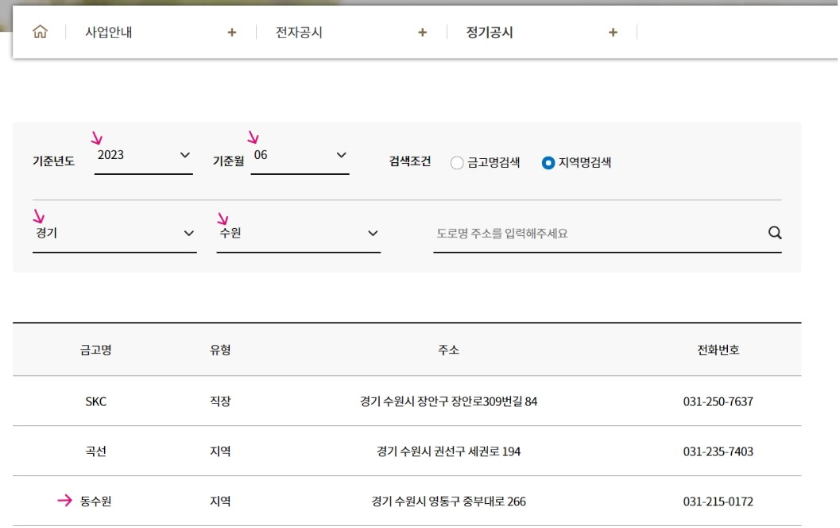 2) 기준연도와 기준월 최근일로 지정 (연 2회 공시 : 6월, 12월) → 지점검색
