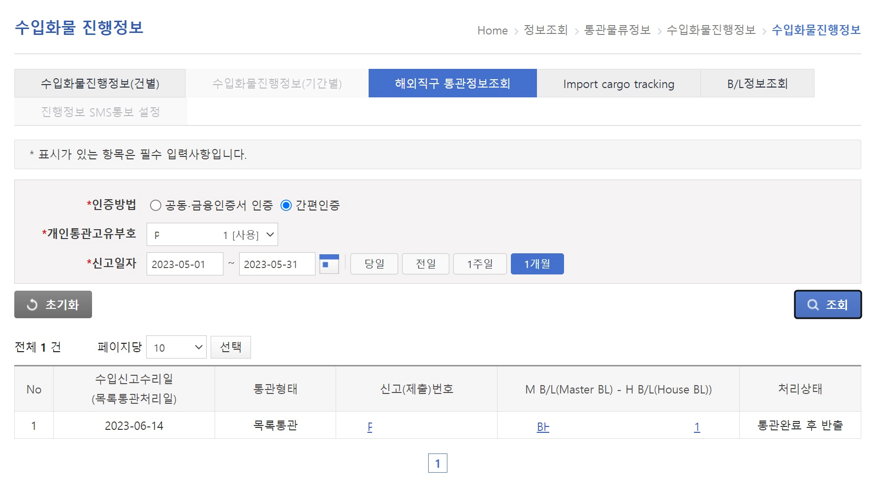 2) 통관결과 확인, 신고일자는 한 달 범위에서 조회할 수 있습니다
