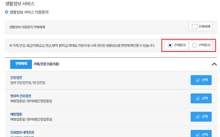 3) 생활정보 서비스 이용 동의에서 전체동의 하고 원하지 않는 항목은 선택해제 하세요.