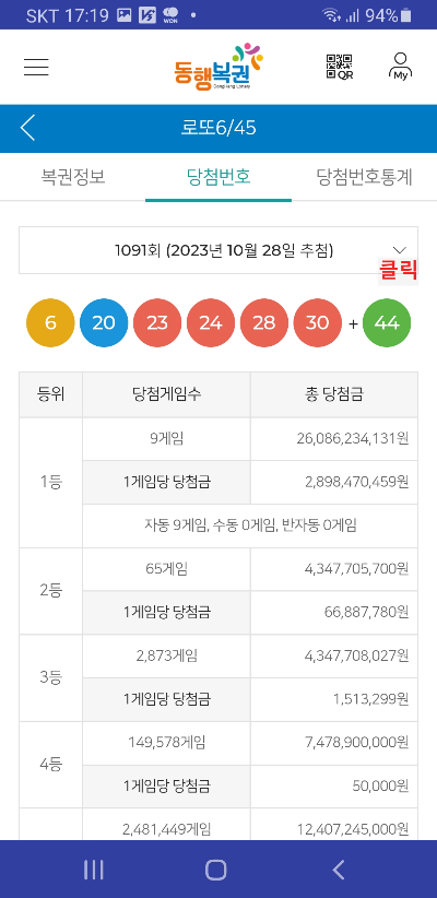 6) 선택한 회차의 당첨번호를 확인하세요.