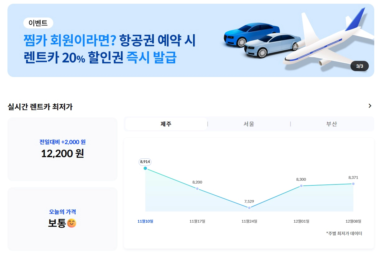 찜카는 항공, 철도, 투어택시, 카쉐어링 등 교통편에 특화된 사이트입니다. 렌트카에 대한 실시간 최저가 정보를 그래프로 직관적으로 볼수 있고, 차량별 예약 후기도 볼 수 있어 편의성과 신뢰도가 좋은 정보를 제공해 줍니다. 그리고 항공권 예매 시 제주도에서 이용할 수 있는 렌트카 20% 할인권도 제공받을 수 있어 최저가에 쿠폰까지 적용하면 정말 저렴하게 여행할 수 있습니다.