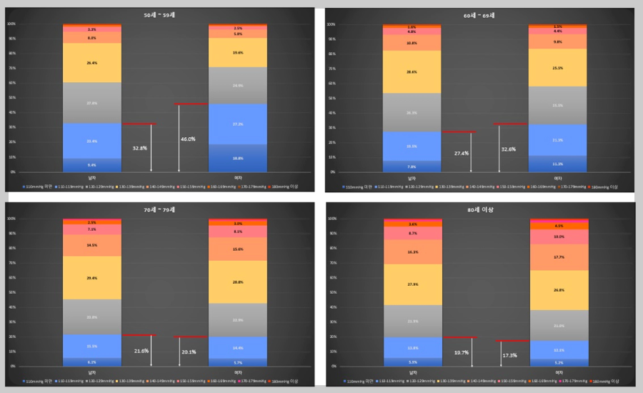 그래프로 확인하면 수축기 혈압과 동일하게 40대 까지는 남성이 여성보다 고혈압 비중이 훨씬 높지만 50대부터 차이가 점점 줄어들어 70대가 되면 남성과 여성의 비중이 역전되는 것으로 나타나고 있습니다. 남성들은 50대 중반까지 사회생활로 인한 회식, 음주 등 혈압상승 요인이 은퇴하면서 해소되기 시작하고, 반면에 여성들은 폐경기 등의 신체적 변화로 인한 영향으로 혈압이 상승되는 것이 아닐까 추측해 봅니다.
