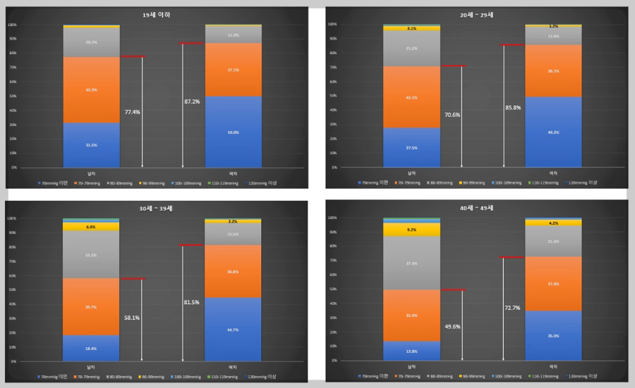 이완기 혈압도 정상범위 80mmHg 미만인 비율은 남성이 55.2%이고 여성은 70.1%로 수축기 혈압과 같이 여성이 전체적으로 정상수치인 비율이 높습니다.
