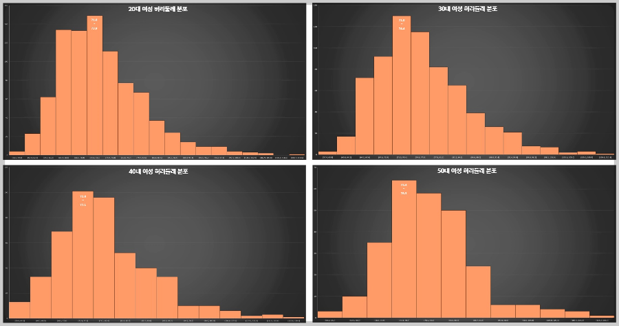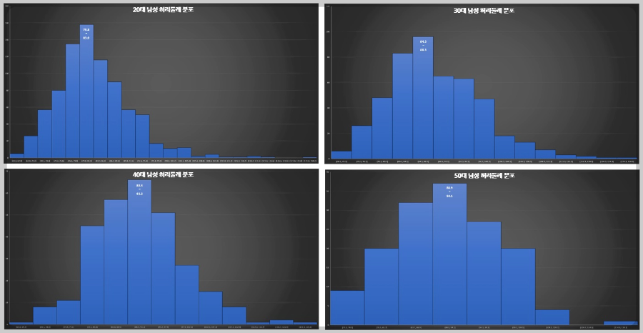 자세한 허리둘레 분포 그래프는 아래 문서파일을 다운로드하시면 크게 보실 수 있습니다. 20대부터 60대까지의 분포 확인할 수 있습니다.
