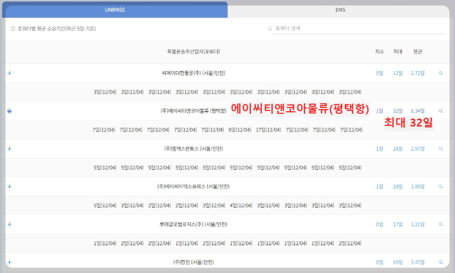 [포워더별 예상 통관소요일]
