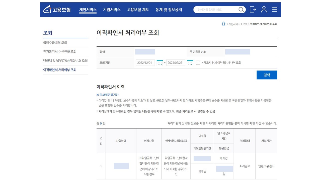 [로그인 > 개인서비스 > 이직확인서 처리여부 조회]