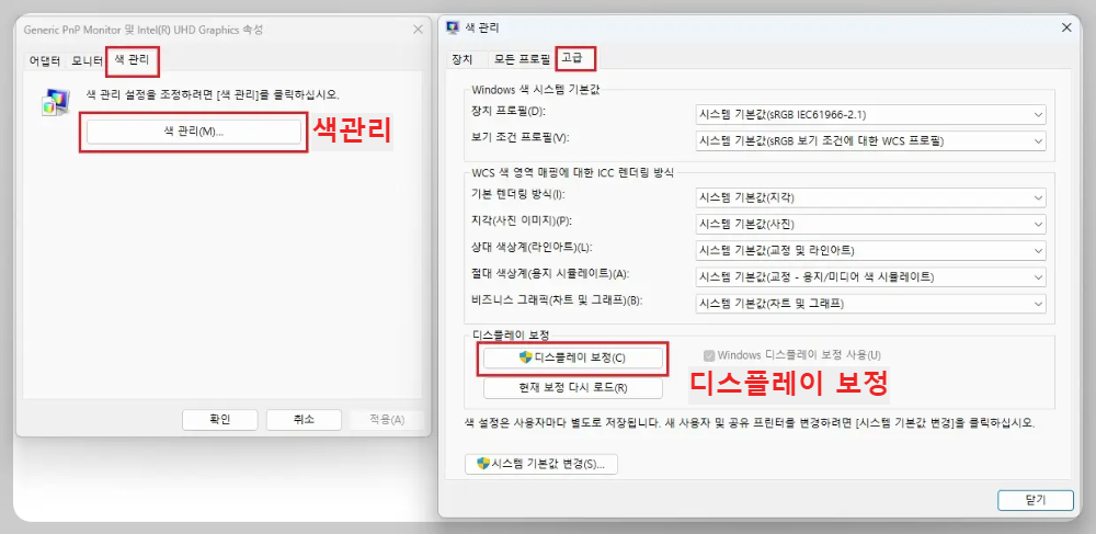 2) 어댑터 속성표시 → 색관리 → 고급 → 디스플레이 보정