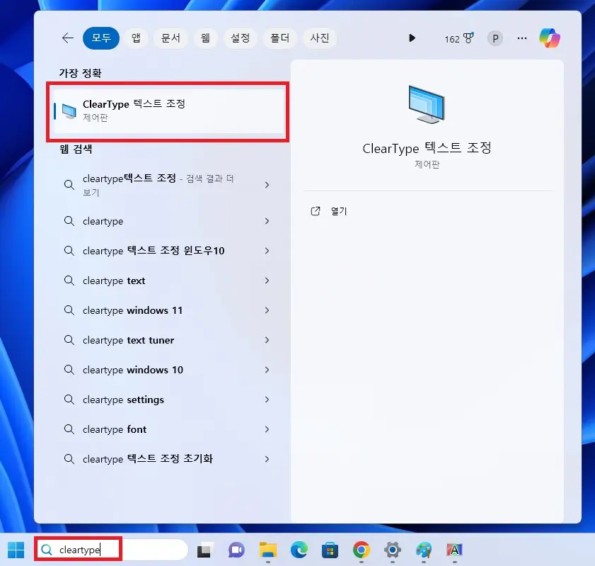 1) 윈도우즈 검색창에 ClearType 입력하면 텍스트 조정 화면에 들어갈 수 있습니다.