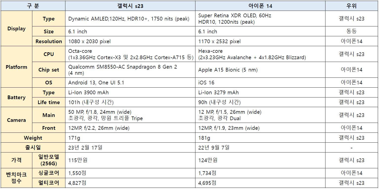 [아이폰 14와 갤럭시 s23 주요 성능 비교]