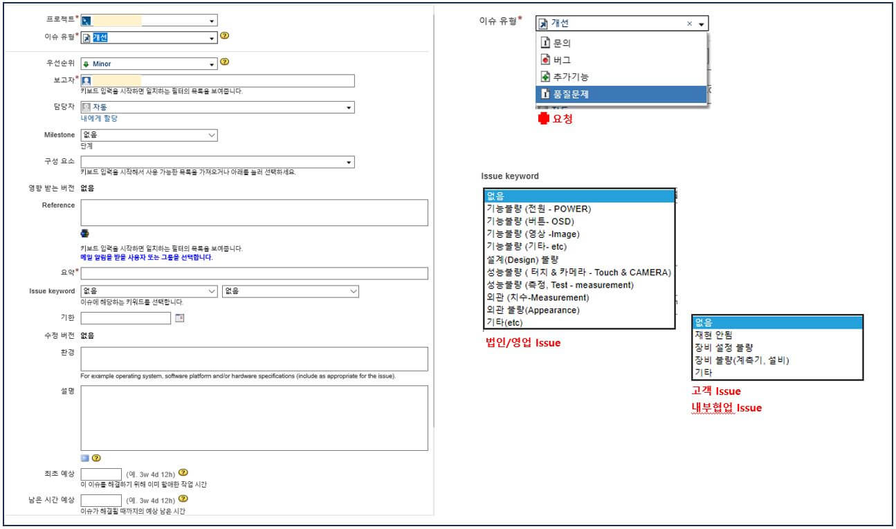 이슈 유형은 설정에 따라 다르지만 개선, 버그, 품질문제, 문의, 추가기능 등으로 선택하여 등록합니다. 그리고 이슈의 우선순위 (Major, Minor 등), 이슈 등록자와 이슈를 해결해야 하는 담당자를 할당하고 이슈 키워드도 등록합니다. 이슈 키워드는 이슈가 발생된 기능과 상세 문제 유형을 선택하여 등록합니다. 그리고 이슈 해결 기한과 상세내용을 발행하면 이슈가 할당된 담당자가 이슈를 해결하는 단계로 넘어가게 되고 이후의 과정은 개선 결과 확인과 검증 그리고 결과 피드백의 순서로 진행되며 이슈가 완결된 것을 확인하고 이슈 발행자가 Colsing 합니다.