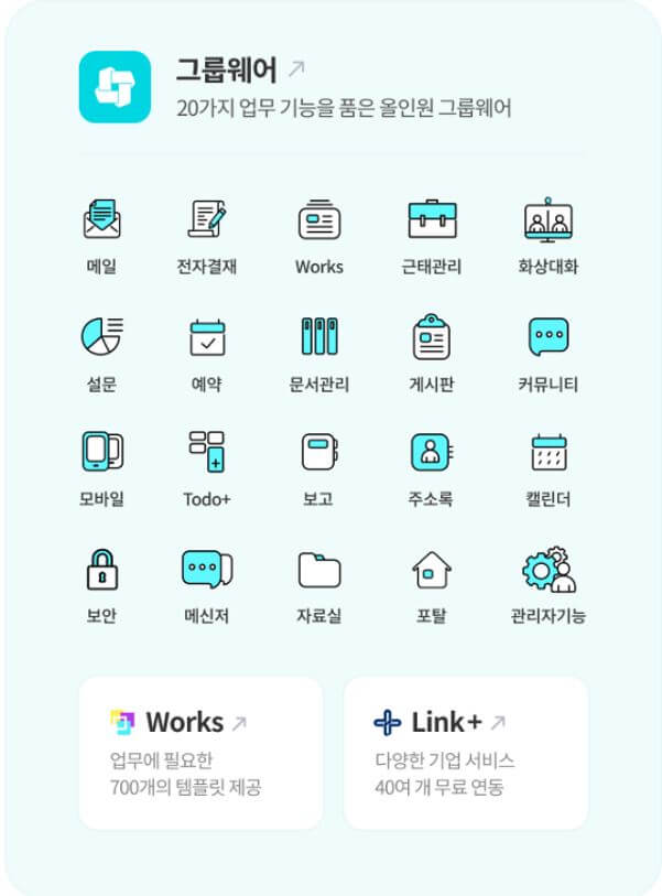 다우오피스는 그룹웨어로 사용시 메일, 전자결재, 문서관리, 커뮤니티, 게시판 등의 20가지가 넘는 업무 기능을 사용할 수 있는 올인원 패키지입니다.