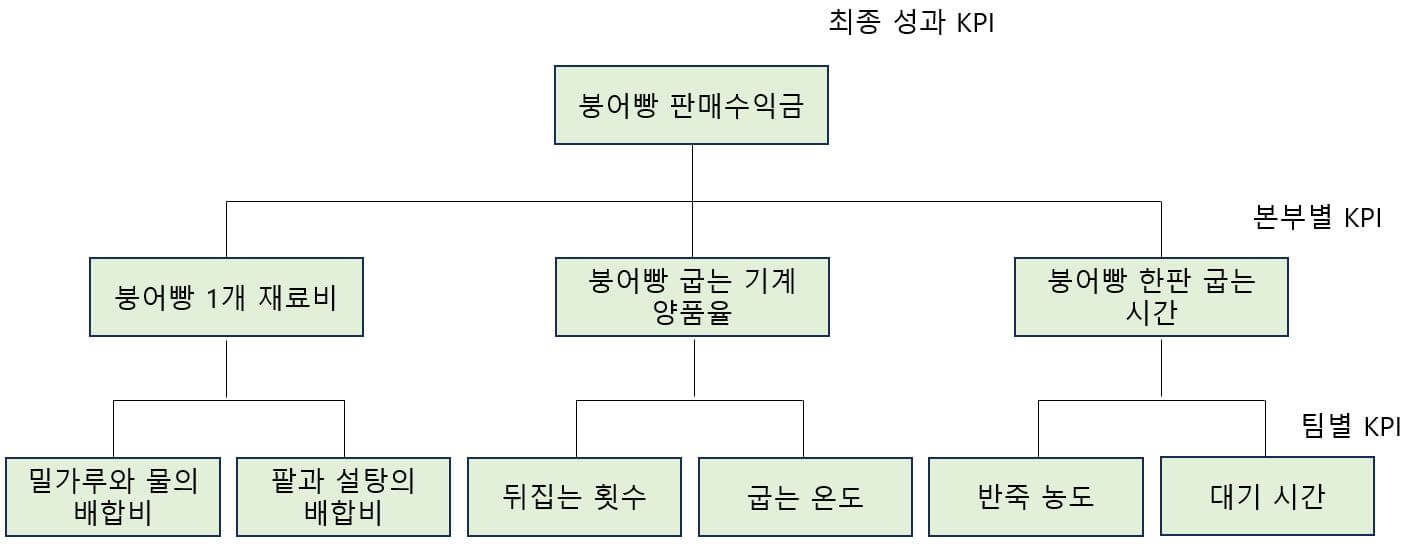 예를 들어 붕어빵을 만들어 파는 회사라면 한 달의 경영성과를 판단하는 최종 성과 KPI는 붕어빵을 팔아서 남은 수익금이 될 것입니다. 수익금을 만들어 내는 하위 KPI로는 붕어빵 재료비와 굽는 기계의 수율, 한판 굽는 시간 등으로 정의할 수 있습니다. 더 하위로 내려가면 밀가루와 물의 배합비, 타지 않게 뒤집는 횟수 등도 KPI로 정의할 수 있습니다. 이처럼 KPI는계층구조로 전개하여 운영합니다. KPI를 제대로 설정하고 또한 측정하고 있다면 발전하고 있는지, 정체되거나 쇠퇴하고 있는지를 정확하게 알 수 있습니다. KPI는 우리가 바른 길을 가고 있는지 알려주는 나침반과 같은 존재로 조직의 운영에 중요하고 필수적인 항목입니다.