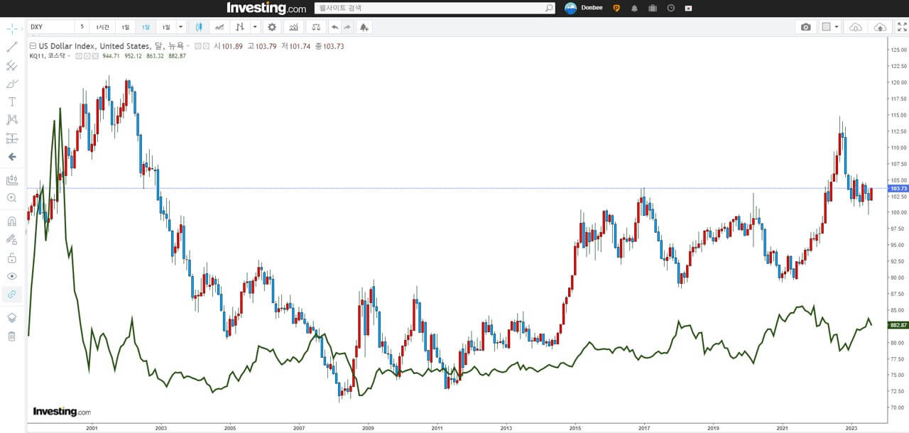 달러인덱스는 미국 달러가 강세인지 약세인지를 나타내는 지표입니다. 달러인덱스가 상승한다는 것은 달러의 가치가 올라갔다는 의미로 미국의 경제 상황이 다른 나라의 경제 상황보다 좋다는 뜻이 됩니다. 달러의 가치 변동에 따라 미국 국채 수익율과 금리에도 영향을 미치고 세계 각국의 환율에도 영향을 미칩니다. 우리나라와 같은 수출 중심 국가는 환율에 따라 기업의 수익성이 크게 변동될 수도 있으니 당연히 증시의 추세와 상관관계가 있을 것임은 쉽게 유추해 볼 수 있습니다. 따라서 달러인덱스와 증시 차트의 추세를 비교해 보는 것도 투자의 효율성을 위해 충분히 의미가 있다고 생각합니다.