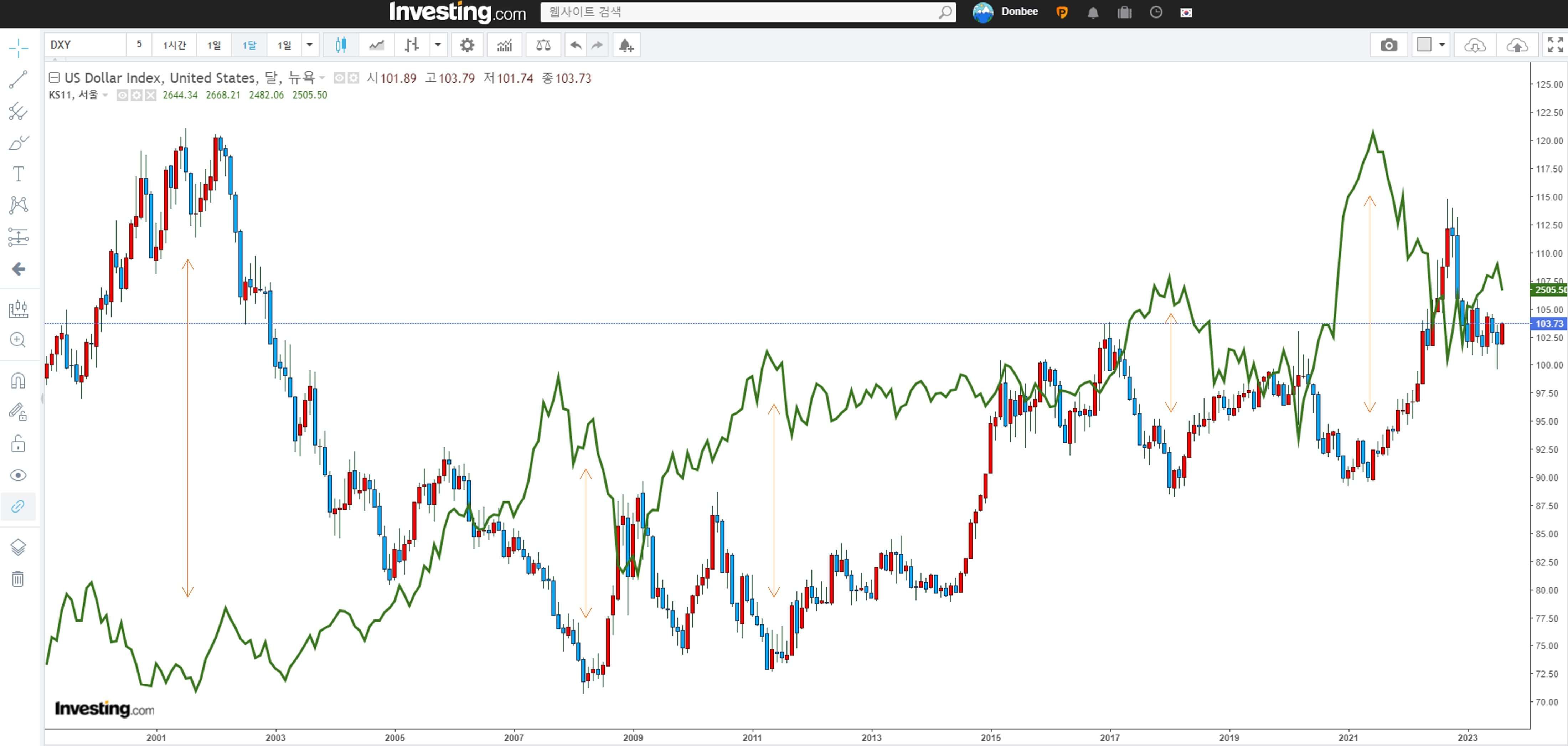 달러인덱스 차트와 코스피 차트는 수치 Data로 증명할 수는 없지만 어느 정도 상관관계를 가진 것과 같은 패턴을 보여줍니다. 23년 간의 장기간에 걸친 추세이니 방향설정에 참고해도 될 것 같습니다.