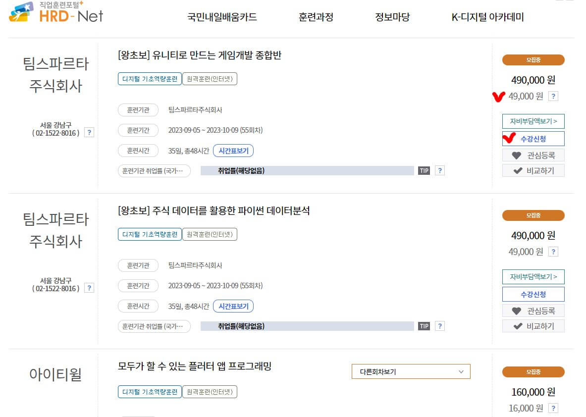 HRD-Net 국민 내일 배움카드 훈련 과정 또는 K-디지털 아카데미 훈련 과정에서 수강할 수 있는 코딩교육 조회 할 수 있습니다.