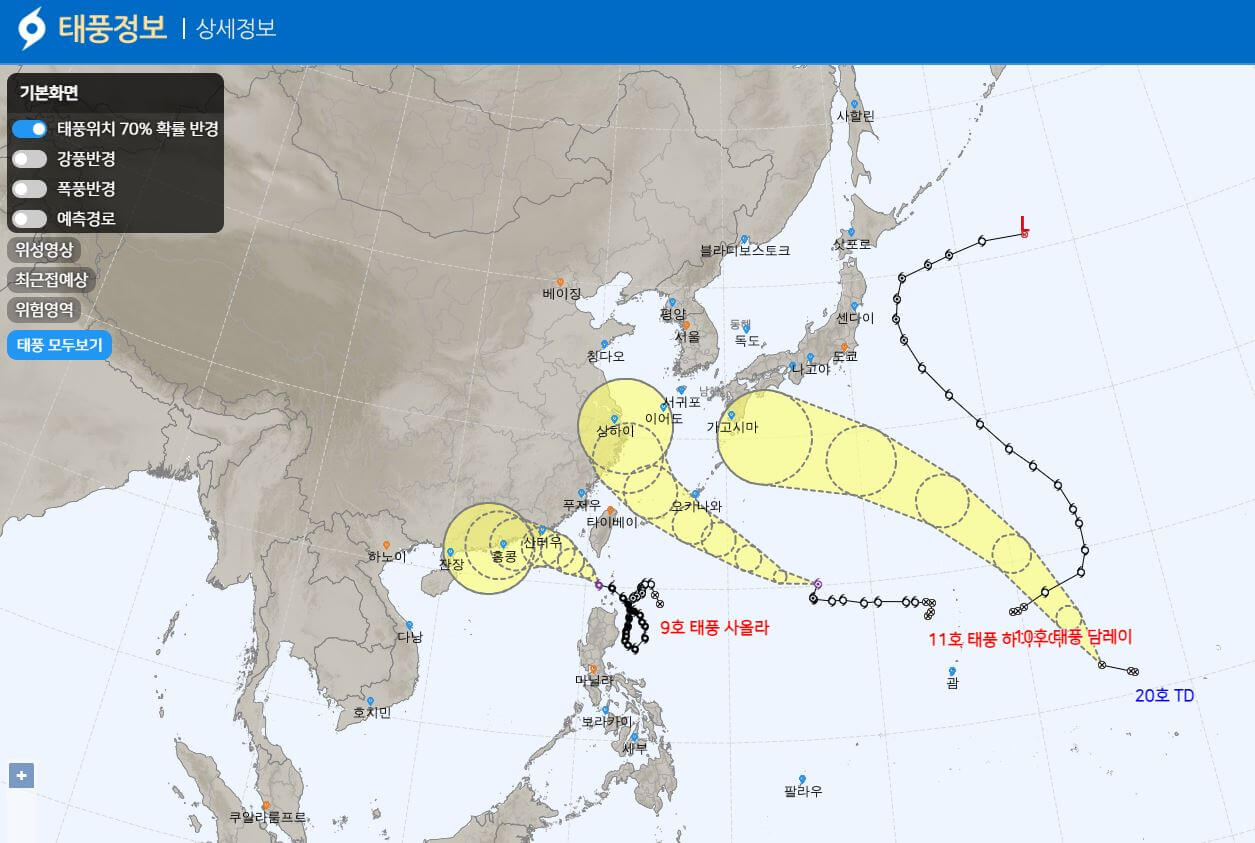 현재 제9호 태풍 사올라와 제11호 태풍 하이쿠이가 활동하고 있고 곧 제12호 태풍이 될 기러기가 발생한 상태입니다. 태풍은 강한 바람과 비로 많은 인명과 재산 피해를 입히게 되므로, 태풍의 경로와 현재 위치 그리고 향후 진로 방향을 수시로 체크하여 대비해야 합니다. 오늘은 태풍의 피해를 최소화하고 휴가철 일정 관리에 도움이 될 수 있도록 태풍의 경로와 향후 진로, 그리고 후지와라 효과에 대해 알아보겠습니다.
